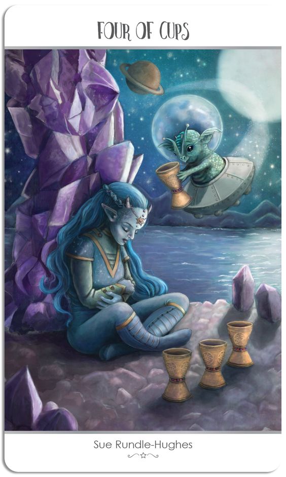 Numa breve pesquisa as palavras que mais se destacam neste tipo de incentivo espiritual andam à volta de: Tristeza, dor, mágoa, stress, passado, erros, fraqueza, conflito, saudade, o outro, etc. Claro que tudo isto existe na nossa vida, faz parte, são lições e desafios a superar não para a andar a vida toda a carregar esse fardo como se fosse uma sacrifício pessoal para conseguir evolução espiritual. Ao entrar nesse ciclo é mais um retroceder do que um avançar a lição nunca fica "arquivada". Mais uma vez, os 3 passinhos fundamentais da superação: Compreender, aceitar e transformar. Depois seguir a vida com a lição aprendida, com harmonia, paz e foco nas coisas boas que podemos alcançar. Sempre que se está na vibração do que está mal, nem se repara nas oportunidades que o cruzam que o podem tirar dessa lamechice. No 4 de copas a figura, nem olha para o copo que lhe é oferecido de tão focada que está nas suas tristezas, é um fado eterno, a carta do amuado com a vida.